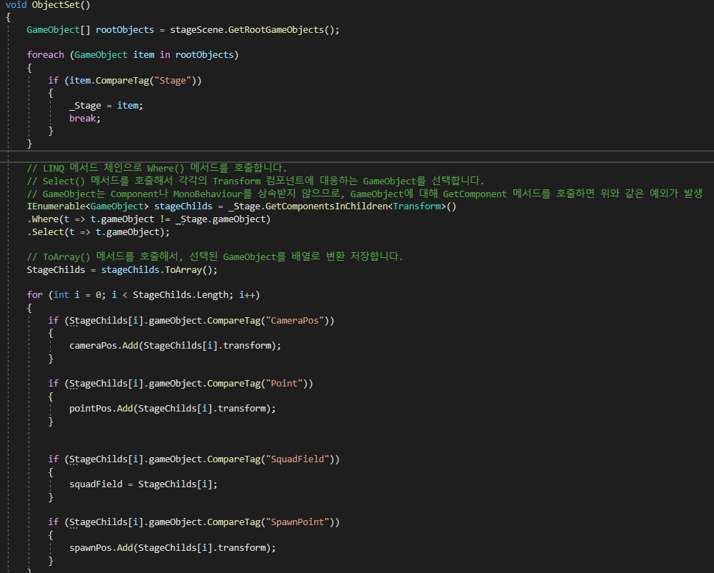 스폰포인트 위치를 저장한 리스트를 순회하며 각 포인트에 프리팹을 생성하고 스테이지 씬의 스테이지, 자식 객체로 생성합니다.