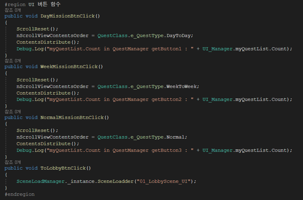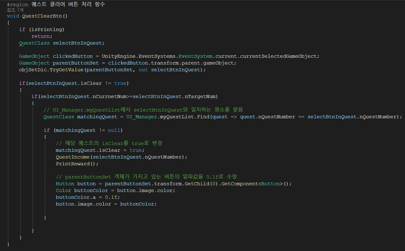 퀘스트 클리어 버튼 처리함수는 아래와 같습니다.