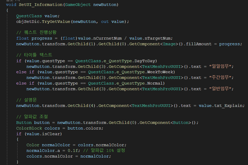 조건문에 따라 적절히 타이틀 텍스트와 설명문을 출력하고 현재 퀘스트 진행상황에 따라 프로그레스 이미지를 FillAmount합니다.