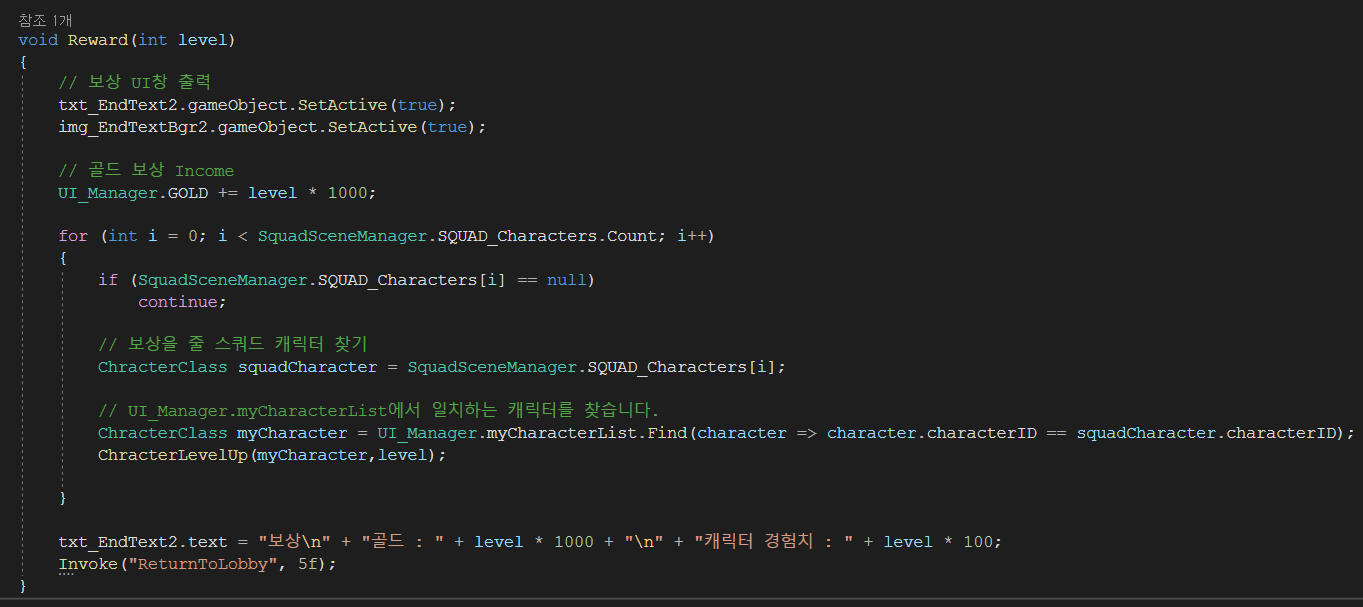 Clear를 true로 바꾸고 QuestIncome를 함수를 호출하고 보상 목록 프린트 함수를 호출합니다.