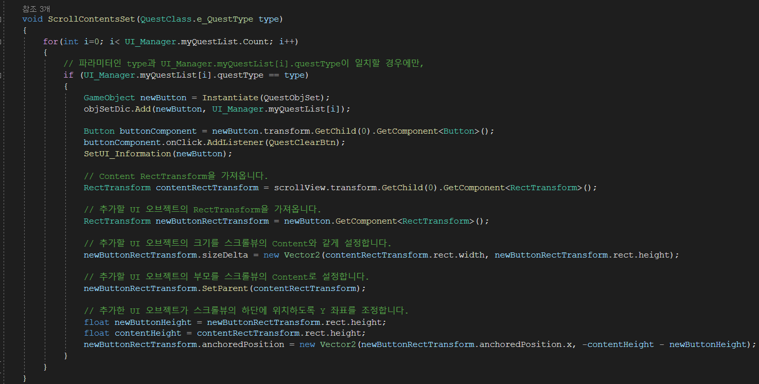 ScrollContentsSet()함수는 스크롤뷰 UI를 채우는 함수입니다.
