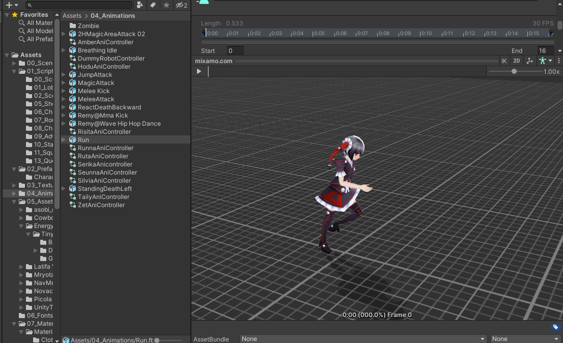 두 번째로 Run : 이동 중인 캐릭터의 달리기 동작 애니메이션입니다.