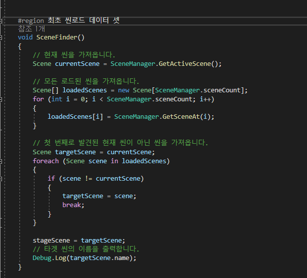 인게임의 프로세스와 매니징 역할을 총괄하는 "02_SceneIngame"씬을 씬로더를 통하여 호출하고, Additive형태로 게임의 배경 및 틀 형태를 담당하는 "03_Stage1_Scene"을 호출하여, 게임을 연결합니다.