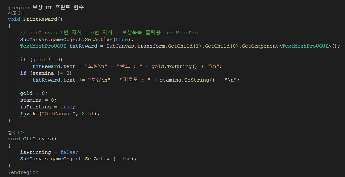 보상 프린트 함수는 QuestIncome함수에서 반영한 gold와 stamina 값을 텍스트로 출력하여, 플레이어가 획득한 보상을 알려주는 함수입니다.