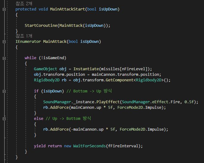 그리고 매개변수로 받은 부울의 참거짓에 따라 AddForece로 탄환을 발사합니다.