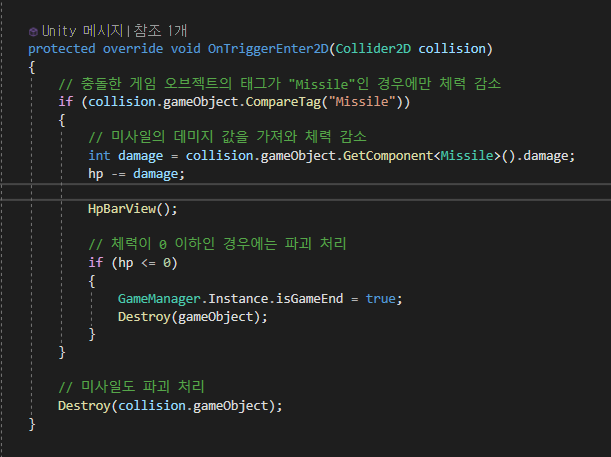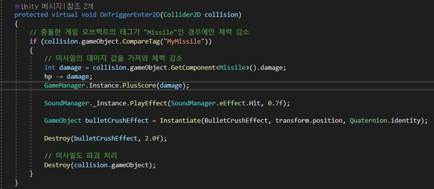 다만, 플레이어 객체의 경우에는 적 미사일 태그를 조건문으로 받아서 데미지를 계산해야 하기 때문에 해당 Virtual 클래스를 Override하여 새롭게 재정의하여 데미지 계산을 합니다.