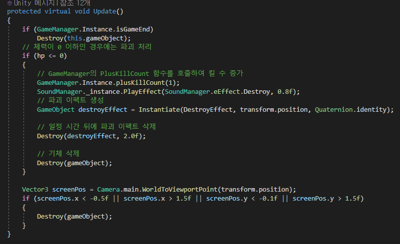 또한, 카메라 시야에서 일정거리 이상 벗어날 경우 객체 파괴.