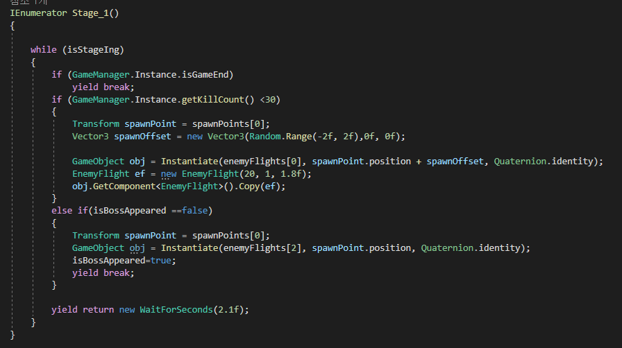 또한, 기체가 파괴될 경우에는 GameEnd를 True로 바꾸어, 게임프로세르를 관리하는 게임매니저 클래스에 송신합니다.