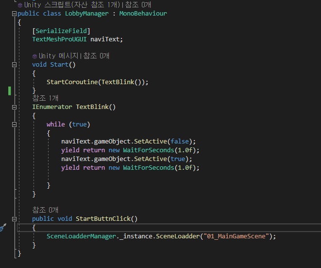 하단의 설명용 텍스트는 코루틴 함수를 이용하여,1초 주기로 문자열이 깜빡이게 만들었습니다.