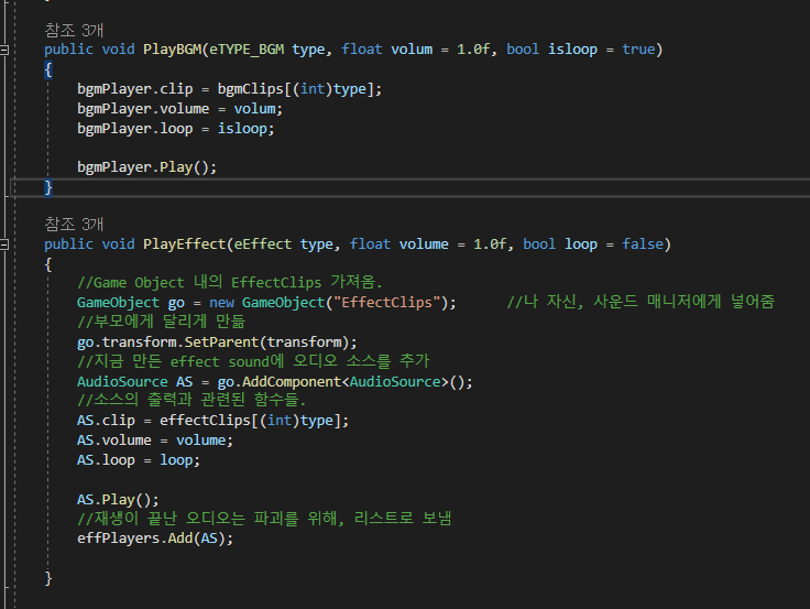 싱글턴을 이용하여 사운드 매니저 내의 해당 함수를 호출하면, AudioSource를 제어하여, AudioClip들을 재생하고 파괴합니다.