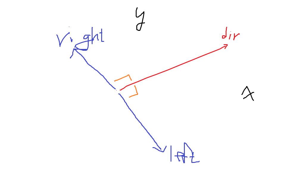 right 벡터: right 벡터의 x-좌표는 direction.y로 설정되고, y-좌표는 -direction.x로 설정됩니다. 이는 direction 벡터의 y-좌표를 그대로 사용하고, x-좌표를 음수로 사용합니다.