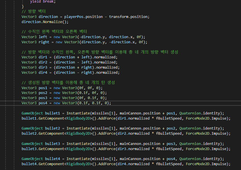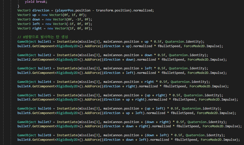 이렇게 구한 방향값으로 탄환을 발사하면, 8방위로 탄을 발사할 수 있습니다.