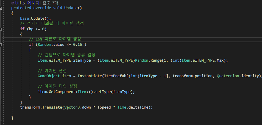 switch문을 이용하여, 객체가 보유한 eItemType에 따라서 충돌체(플레이어)를 매개변수로 넘기고 함수를 호출합니다.