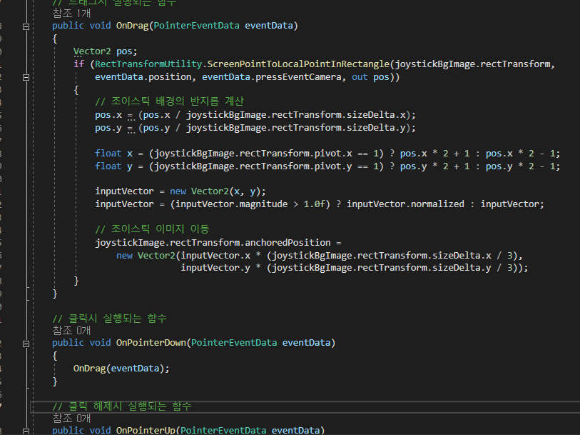 OnDrag 함수에서는 클릭한 위치의 좌표를 받아서, 조이스틱 배경의 크기에 맞게 정규화하고, 입력 벡터 값을 계산합니다. 이후, 조이스틱 이미지의 위치를 입력 벡터 값에 따라 이동시킵니다.