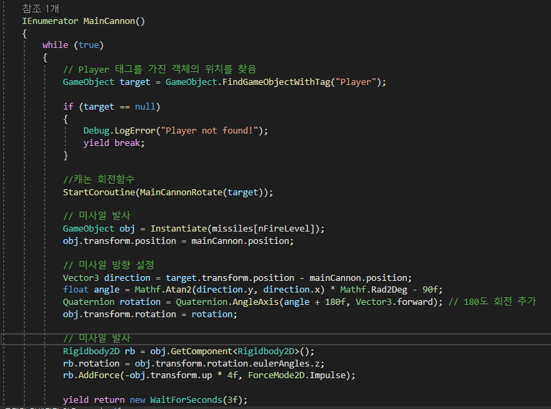 하지만, 포탑이 3초 단위로 움직인다면 부자연스럽기 때문에 MainCannonRotate는 따로 코루틴함수를 호출하여 관리합니다.