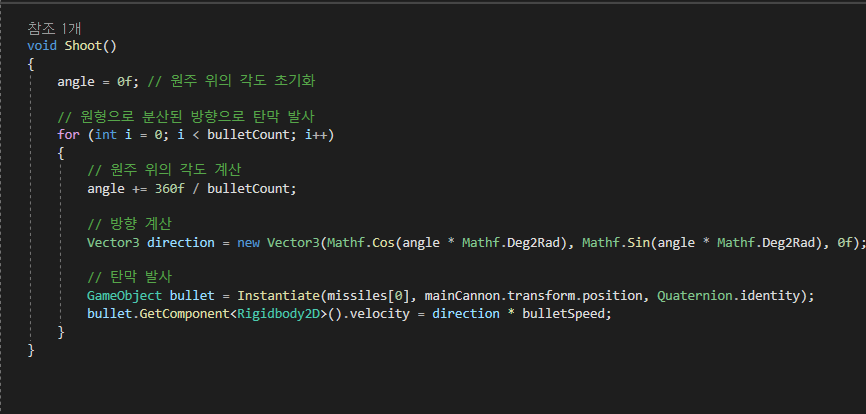 angleStep = 360f / numShots는 원주를 numShots로 나눈 값으로, 미사일 간의 발사 각도 간격을 계산합니다.
