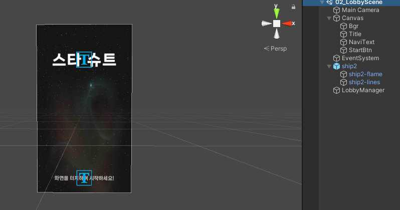 화면 전체를 감싸는 버튼 오브젝트가 존재하여, 사용자의 클릭을 입력받아, 게임씬으로 넘어가도록하는 역할을 합니다.