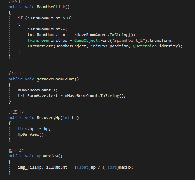 BoomUseClick은 BoomCount의 조건을 돌려 참일 경우, 값을 감산하고 폭격기를 생성시킵니다.