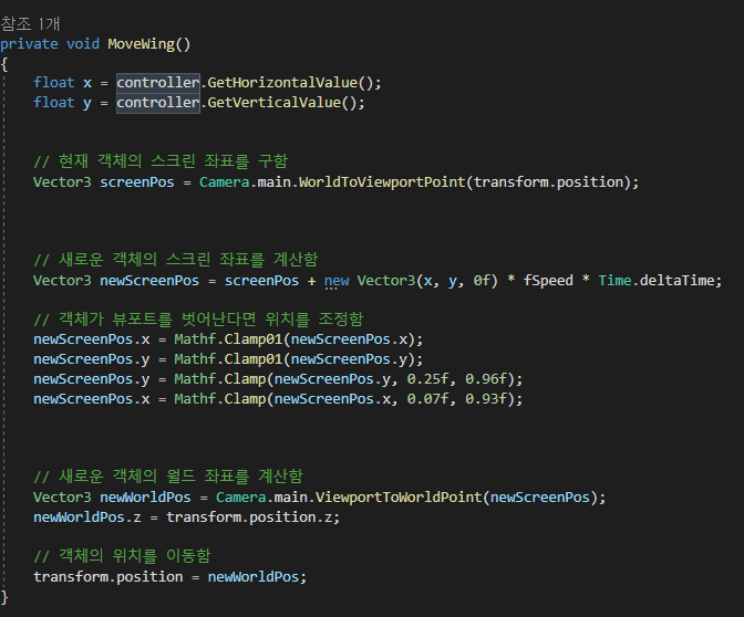 기체가 카메라 바깥으로 벗어나면 안 되기 때문에 스크린 좌표를 계산하고 Clamp함수를 이용하여 값을 보정해줍니다.