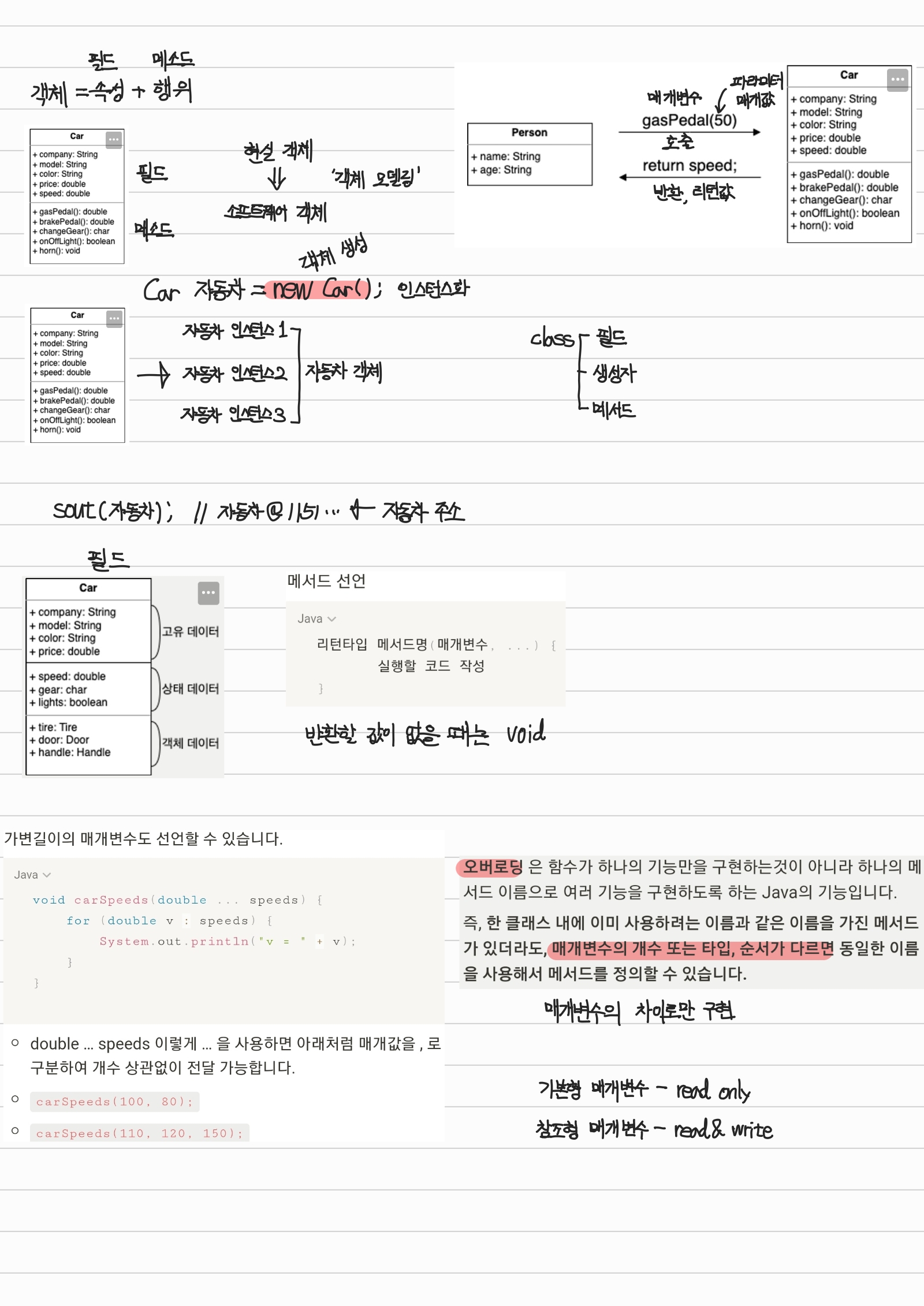 클래스 설계, 객체 생성, 필드와 메서드, 매개변수의 종류, 인스턴스 멤버와 클래스 멤버