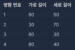 가장 긴 가로 길이와 세로 길이가 각각 80, 70이기 때문에 80(가로) x 70(세로) 크기의 지갑을 만들면 모든 명함들을 수납할 수 있습니다. 하지만 2번 명함을 가로로 눕혀 수납한다면 80(가로) x 50(세로) 크기의 지갑으로 모든 명함들을 수납할 수 있습니다. 이때의 지갑 크기는 4000(=80 x 50)입니다.
