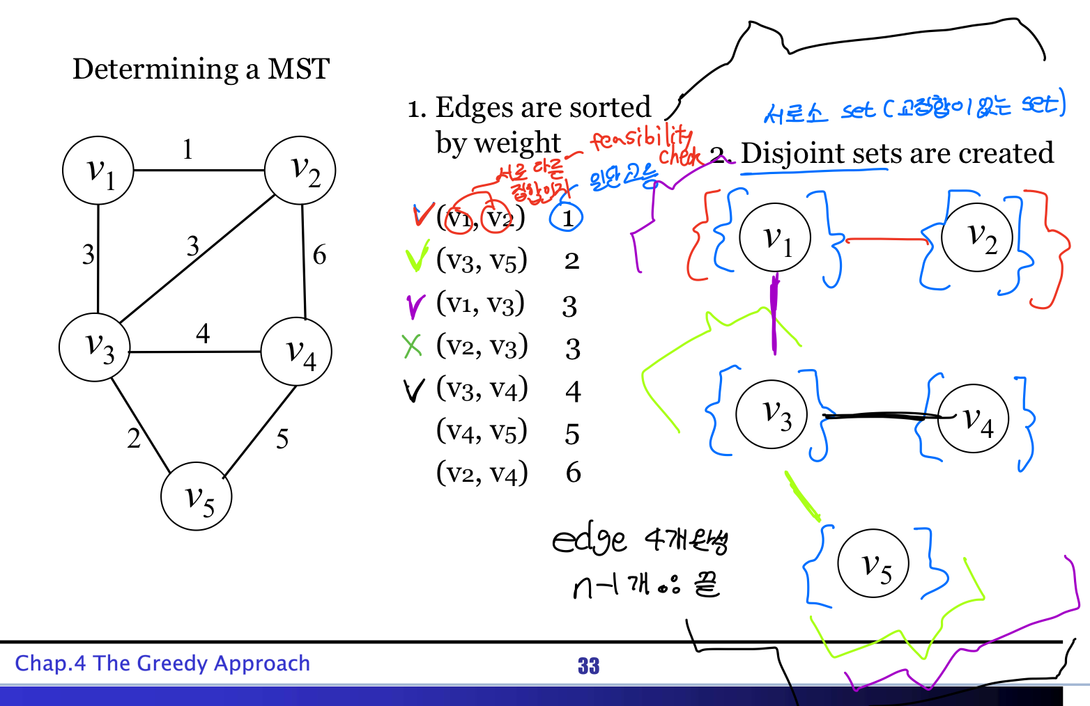 집합을 합치고 아니면 PASS하여 MST를 완성한다.