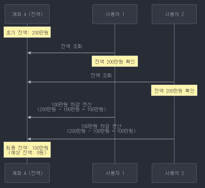 - 사용자 1과 2의 이체가 동시에 이루어지면서, 계좌에서 100만원씩 빠져나가면 총 200만원이 출금되어 잔액이 없어야 하지만, 실제 계좌에는 100만원이 남게 된다.