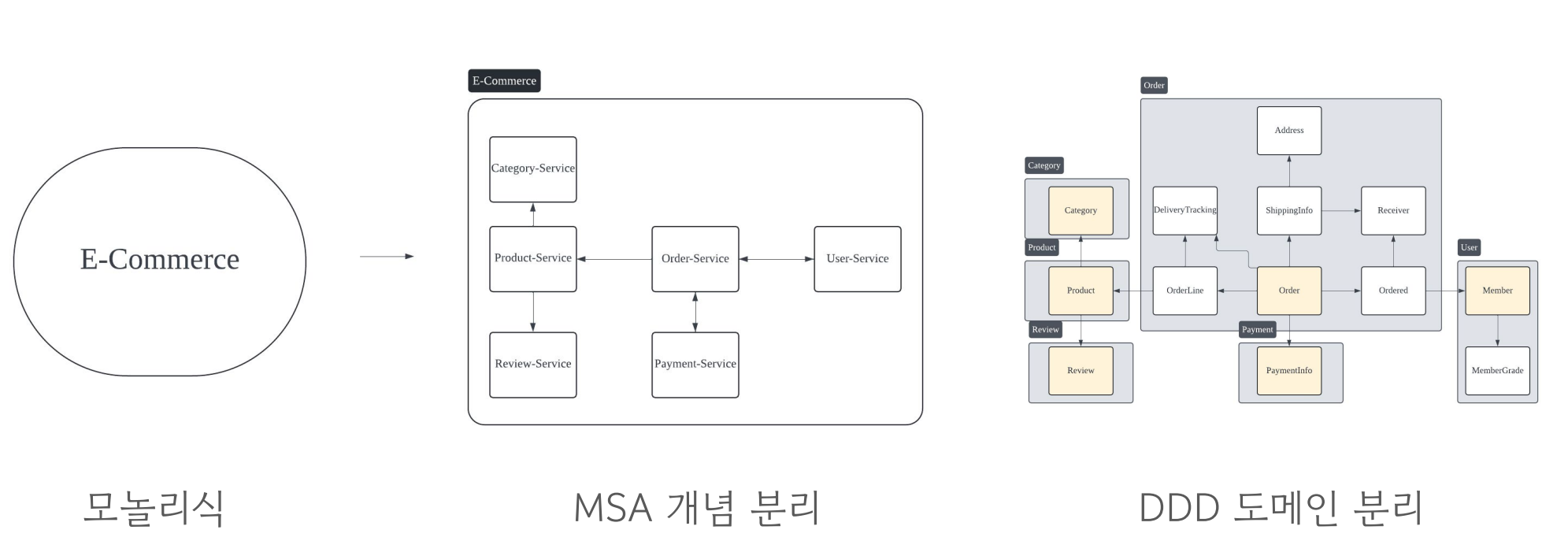 복잡한 비즈니스 로직이나 모놀리식 애플리케이션을 MSA로 전환할 때, 가장 중요한 것은 서비스의 경계를 명확히 나누는 것이다. 예를 들어, 모놀리식 이커머스 플랫폼을 MSA로 전환할 때는 주문, 상품, 리뷰와 같은 도메인 개념을 기준으로 마이크로서비스를 구축하게 된다.
