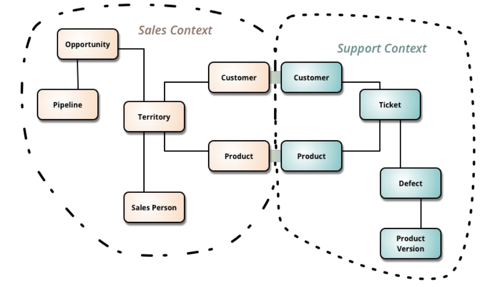 도메인 모델을 만들기 위해서는 핵심 구성 요소, 규칙, 기능을 파악해야 한다. 서비스의 요구사항을 분석하고 관련 기능들을 묶으면, 아래와 같은 구조를 만들 수 있다. 이런 도메인 모델의 집합을 바운디드 컨텍스트(Bounded Context)라고 한다.
