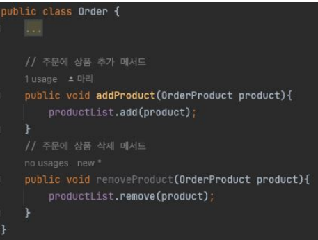 이 예시 코드는 루트 애그리거트의 메서드를 통해 간접적으로 OrderProduct(하위 엔티티)에 접근하고 있다. 이를 통해 하위 엔티티들은 루트 엔티티의 라이프사이클을 따르게 된다.