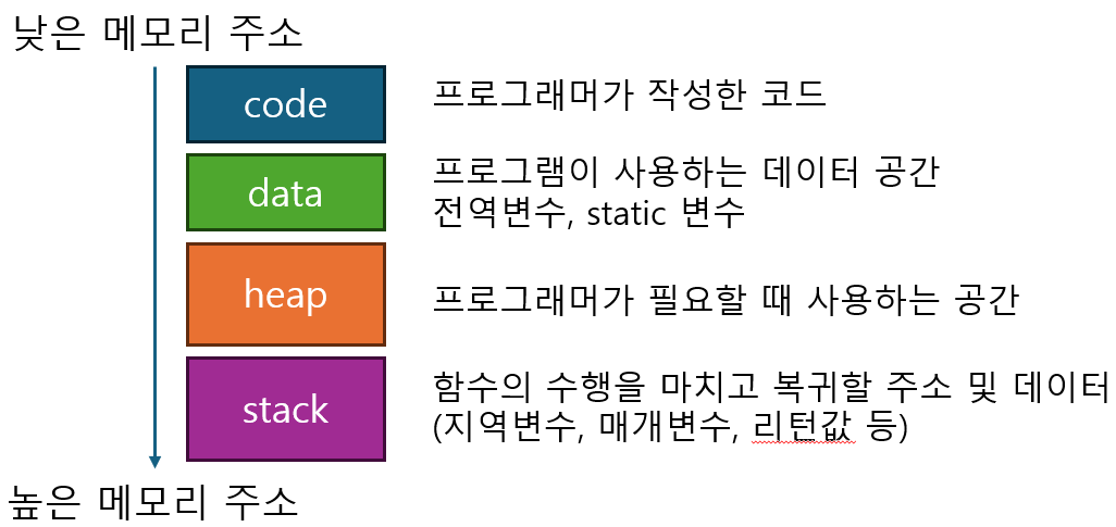 - 코드(code)영역, 데이터(data)영역, 스택(stack)영역, 힙(Heap)영역 이다.