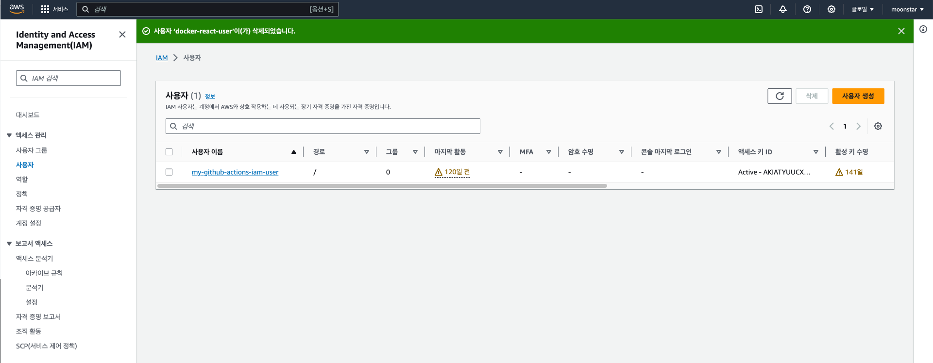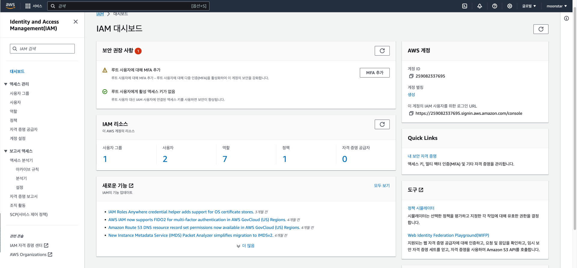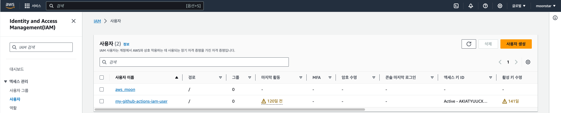 이전에 만들었던 aws_moon 사용자를 사용하여 테스트를 해보겠습니다.