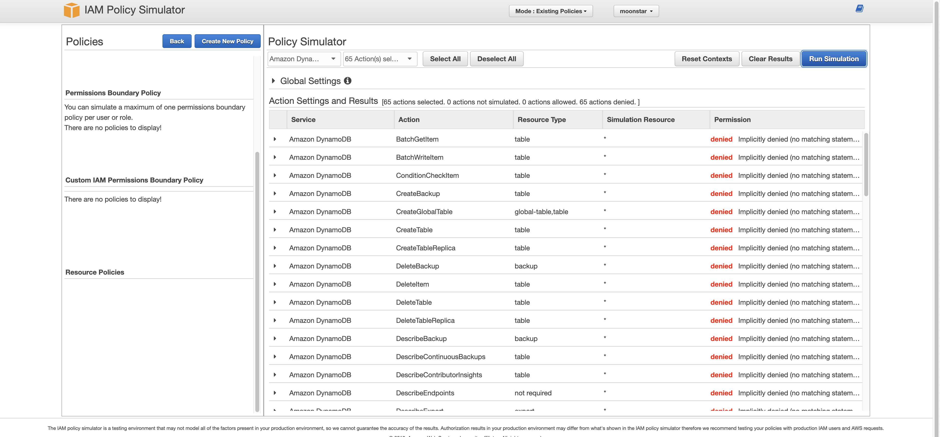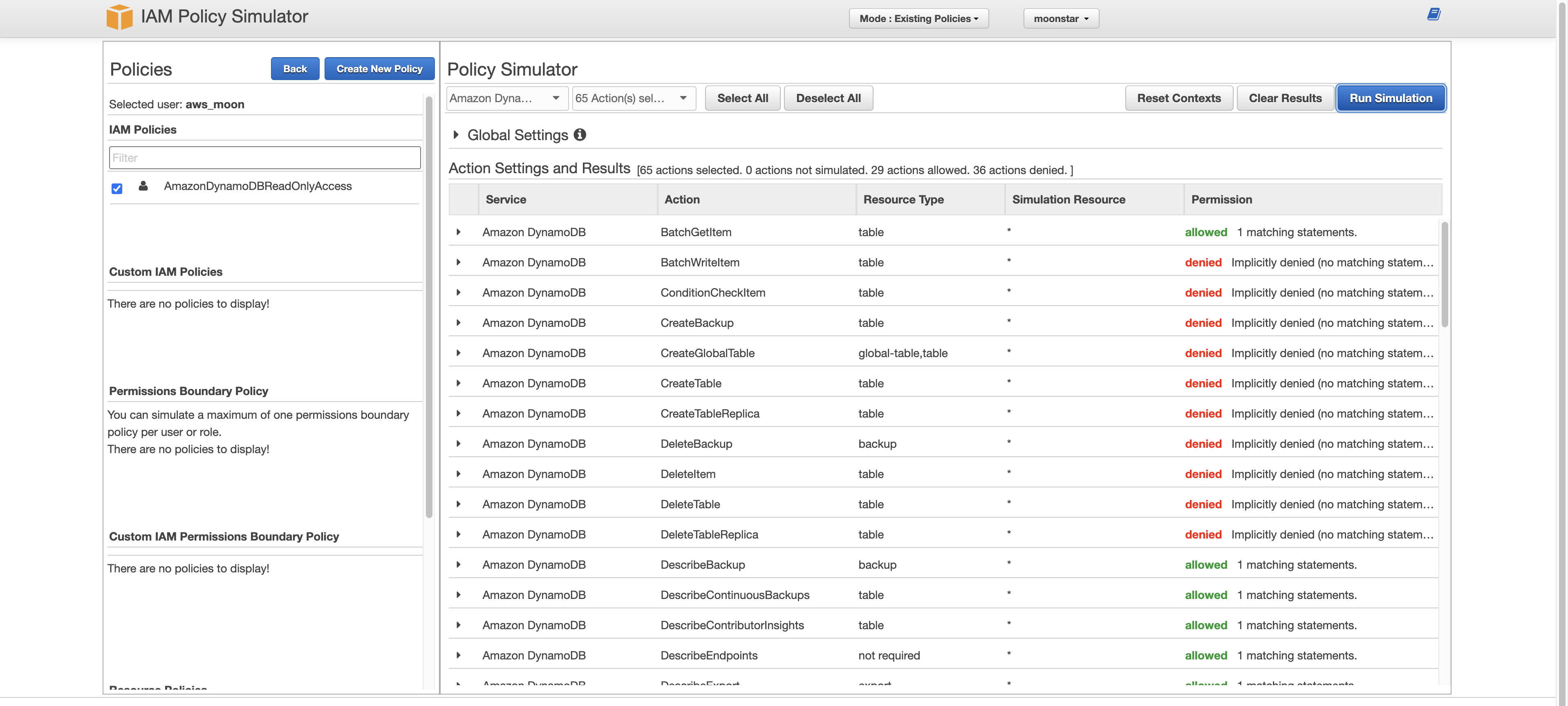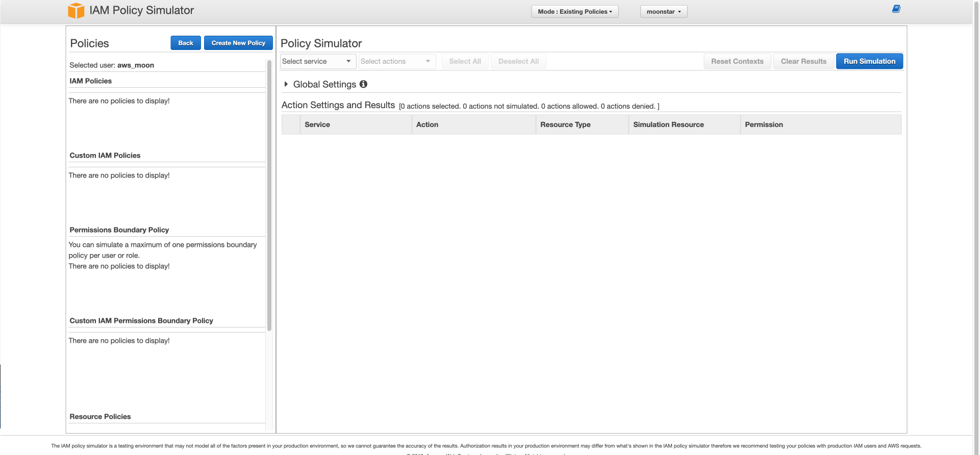 그러면 이 정책 시뮬레이터를 동작하여 aws_moon 유저는 아무것도 할 수 없는지 한 번 테스트 해보겠습니다.