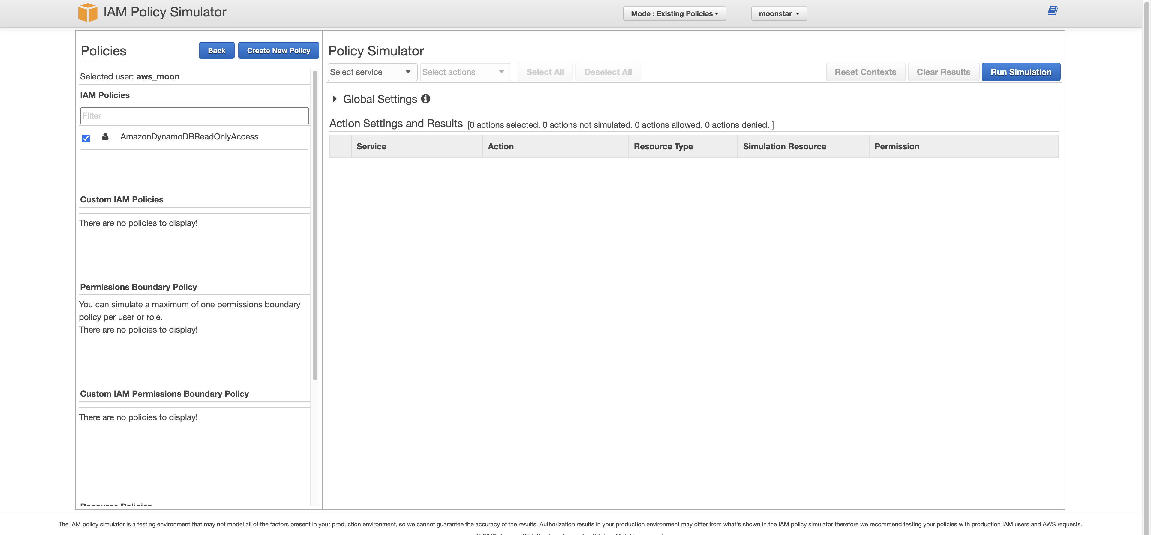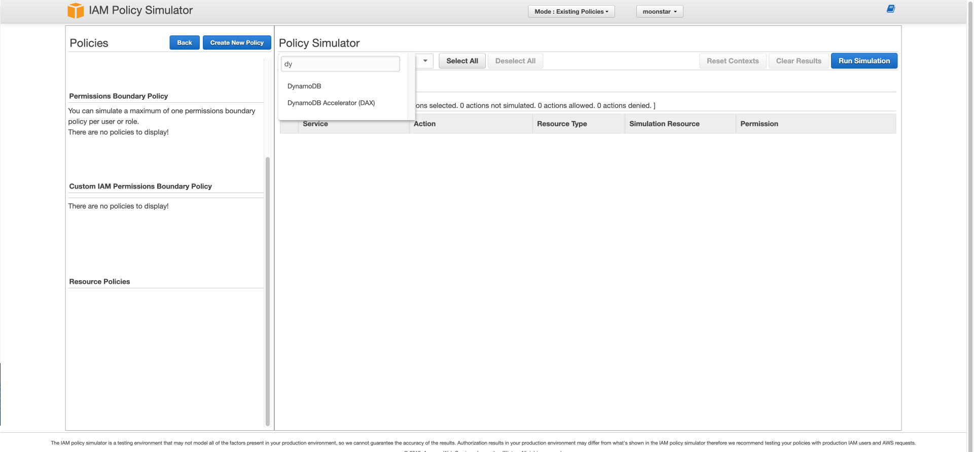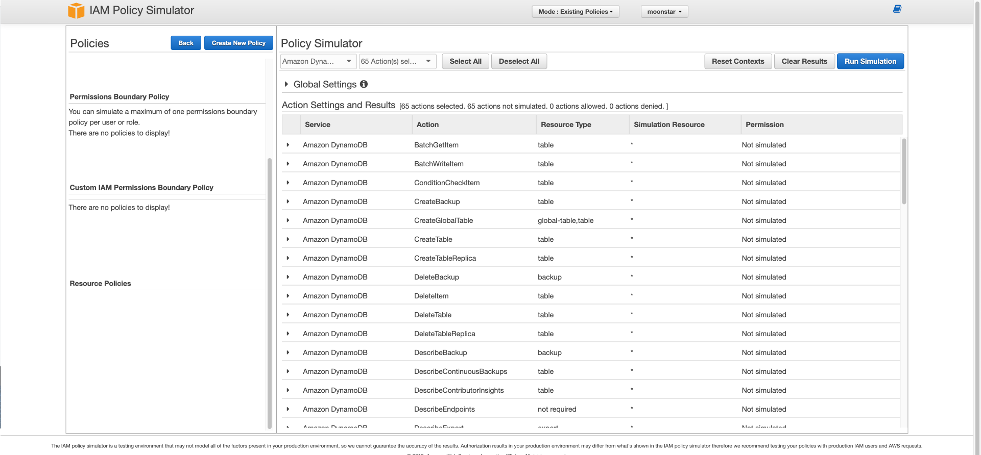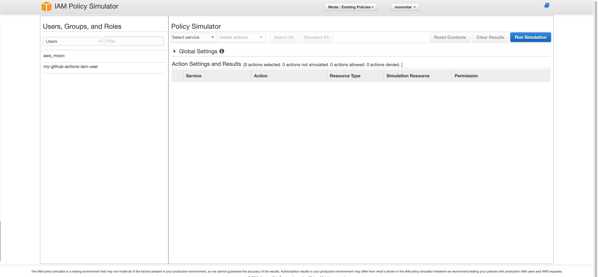 그러면 이 정책 시뮬레이터를 동작하여 aws_moon 유저는 아무것도 할 수 없는지 한 번 테스트 해보겠습니다.