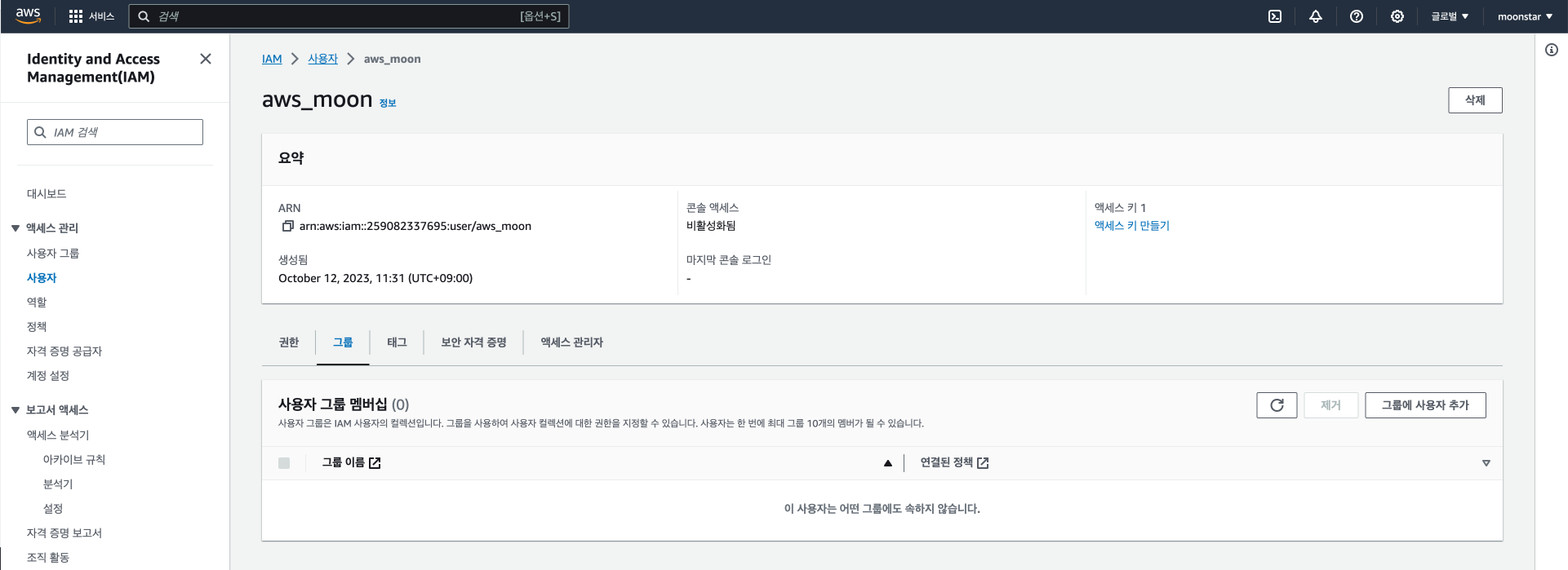 그럼 이제 aws_moon 이라는 사용자는 aws_moon_group이라는 그룹에 속해 있는 것을 확인할 수 있습니다.