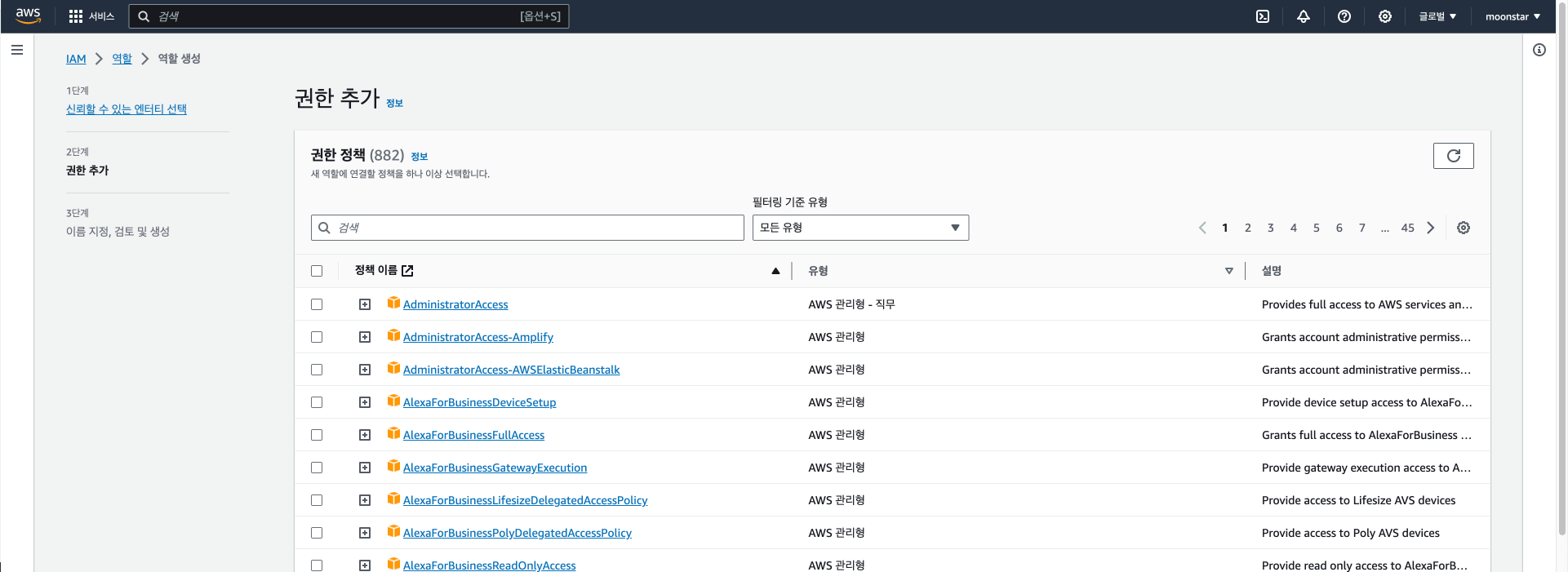 그러면 생성하는 역할에 추가하고 싶은 정책을 만들 수도 있고 기존에 존재하는 권한을 추가할 수 있습니다.