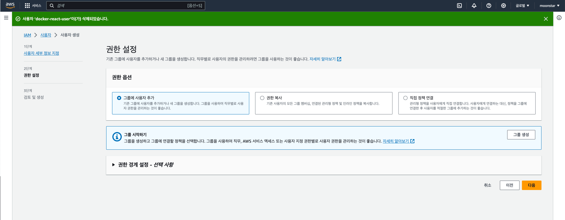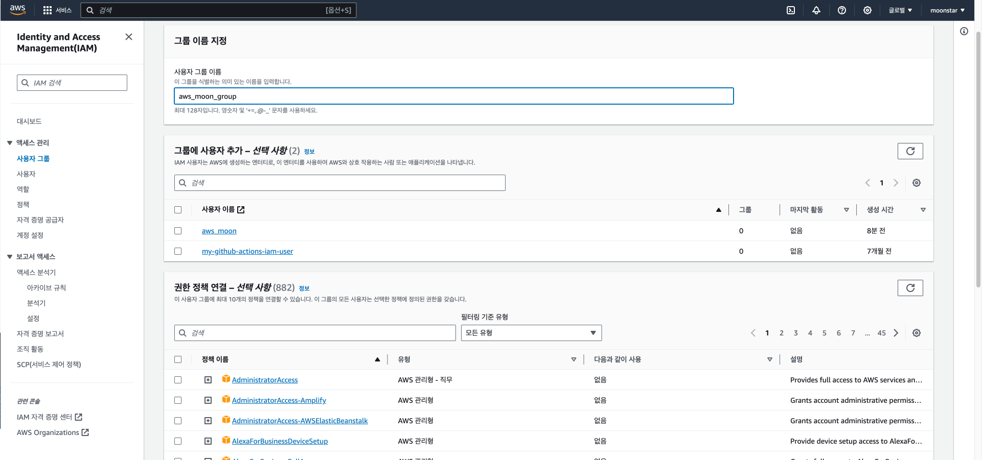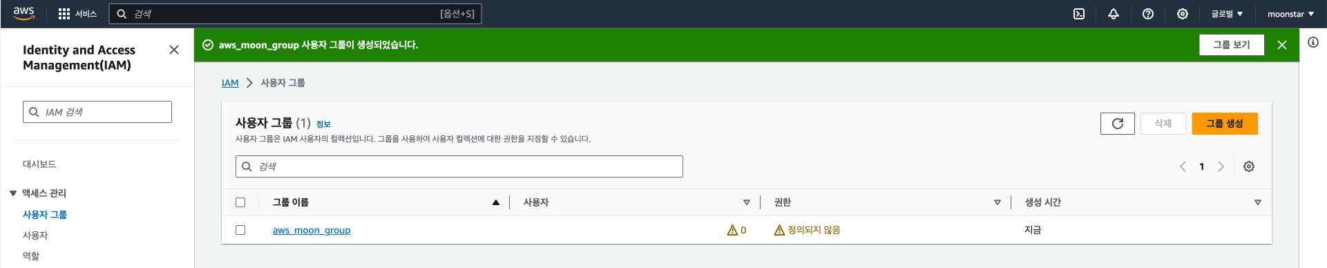 이렇게 aws_moon_group 이라는 이름의 그룹이 생성되었습니다.