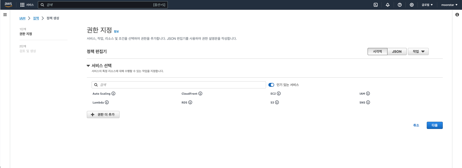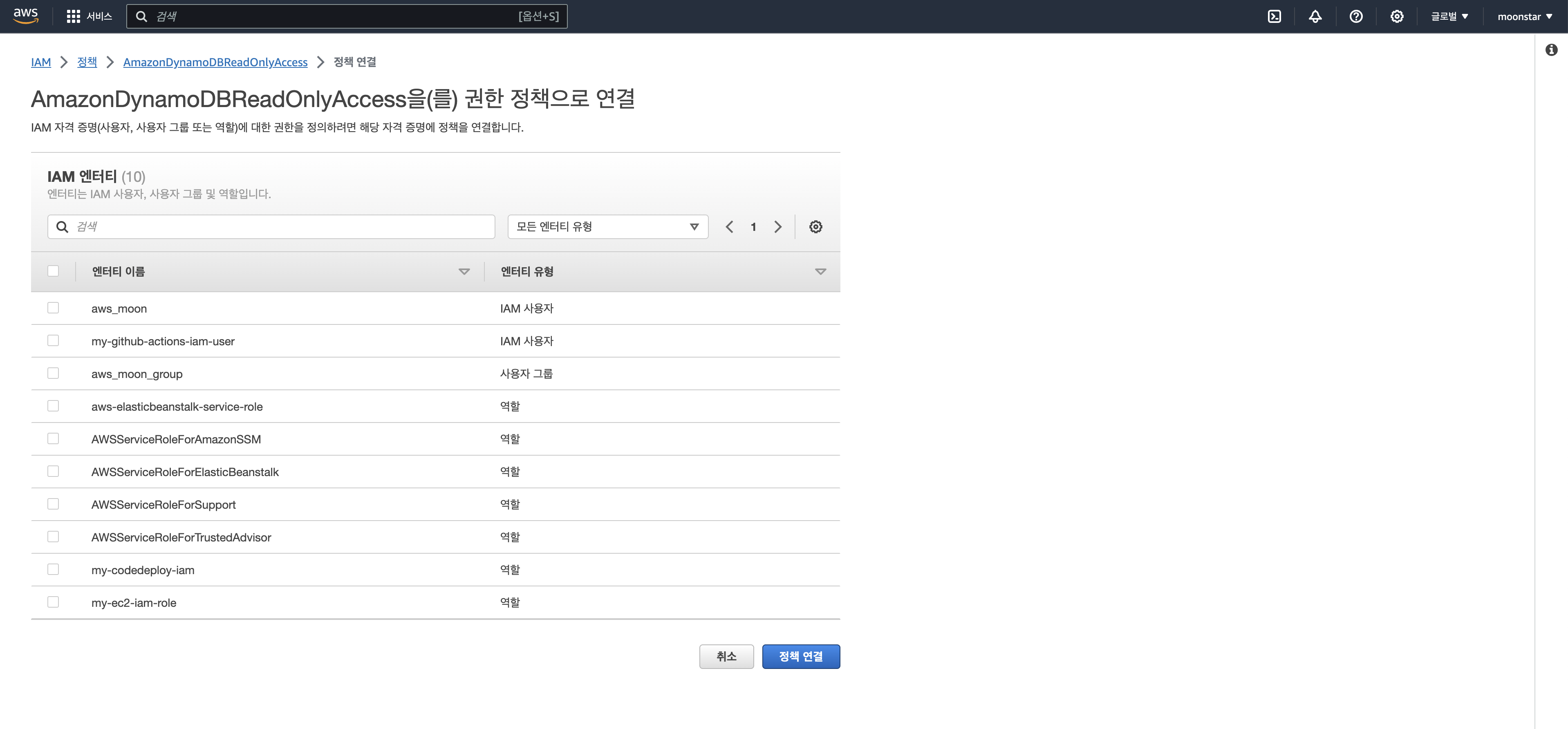 그런 다음 우리가 이전에 만들었던 aws_moon을 선택하여 정책을 연결 해줍니다.