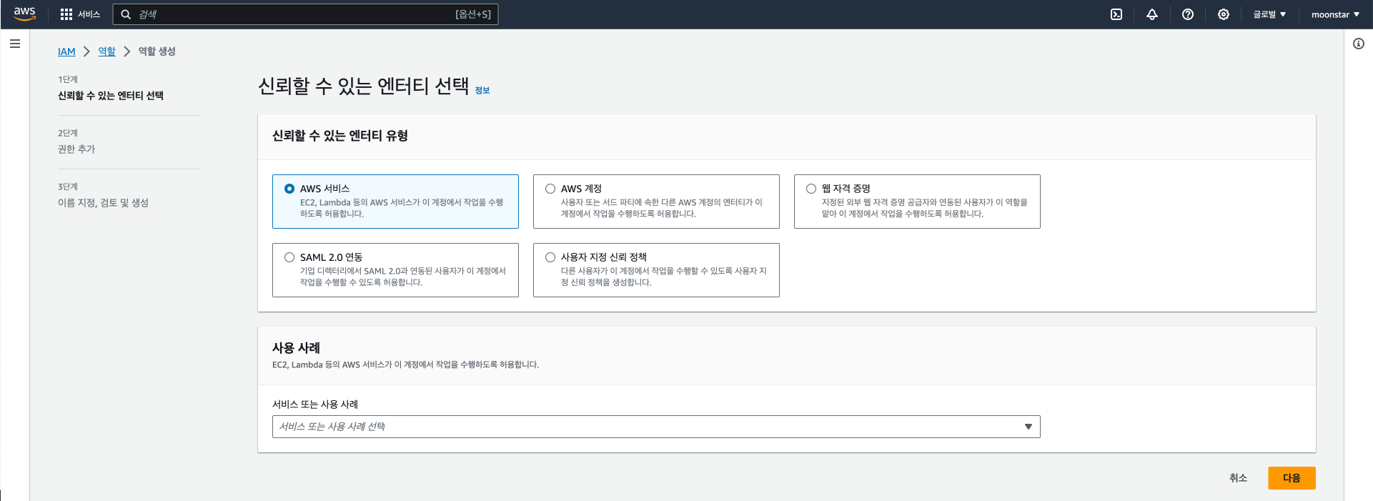 저는 AWS 서비스를 선택하고 사용 사례로는 EC2를 선택하여 다음으로 넘어가겠습니다.