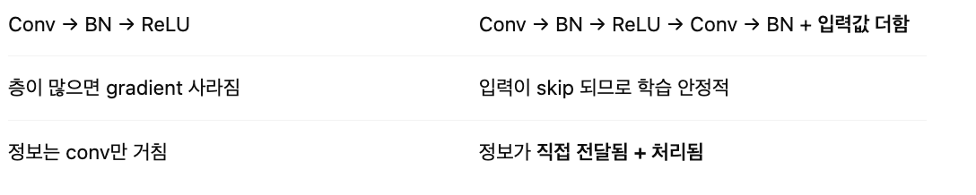 Conv → BN → ReLU 흐름이 반복되는 구간에 → “ResidualBlock”이 그 자체로 하나의 블록으로 끼어들어감. ResNet (Residual Network)은 딥러닝 네트워크가 깊어질 때 학습이 어려워지는 문제를 해결하기 위해 등장한 구조
