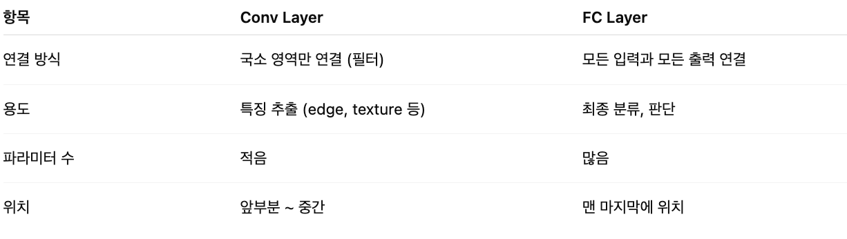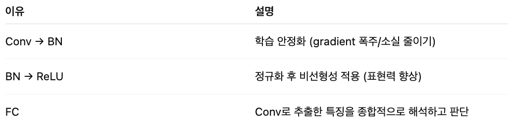 Conv는 특징을 뽑고, BN은 학습을 안정화하고, FC는 그걸 바탕으로 최종 판단하는 역할이다. 실제 CNN은 이 3가지를 모두 잘 섞어 쓴다.