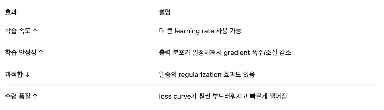 딥러닝의 각 층에서 출력값의 분포를 정규화(Normalize)해서 학습을 빠르고 안정되게 만드는 기법