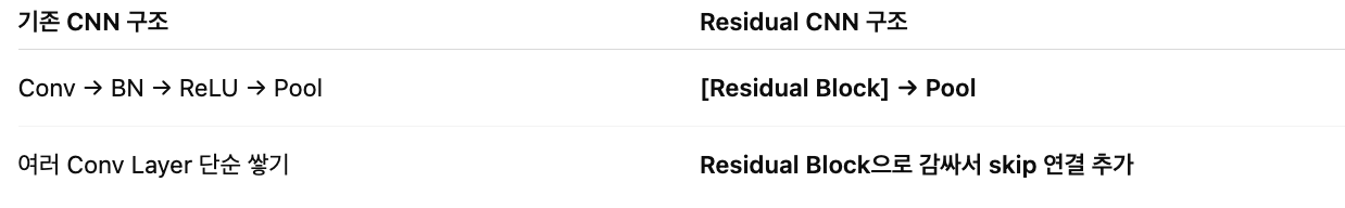 즉, 기존 Conv 쌓는 부분을 Residual Block으로 묶고 skip connection을 추가한 것