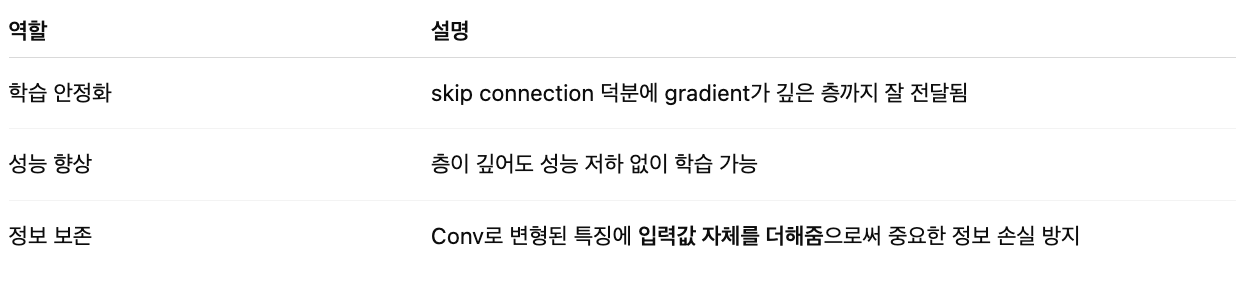 핵심 아이디어 : 입력값을 다음 층의 출력에 직접 더해주는 Skip Connection을 추가.