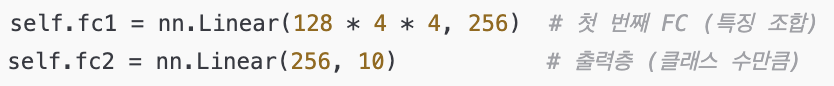 완전 연결 계층 (Fully Connected Layer): 추출된 특징을 기반으로 최종 분류를 수행. 최종 추출된 특징들을 모두 연결해서 → 클래스 분류 결정(확률 출력)