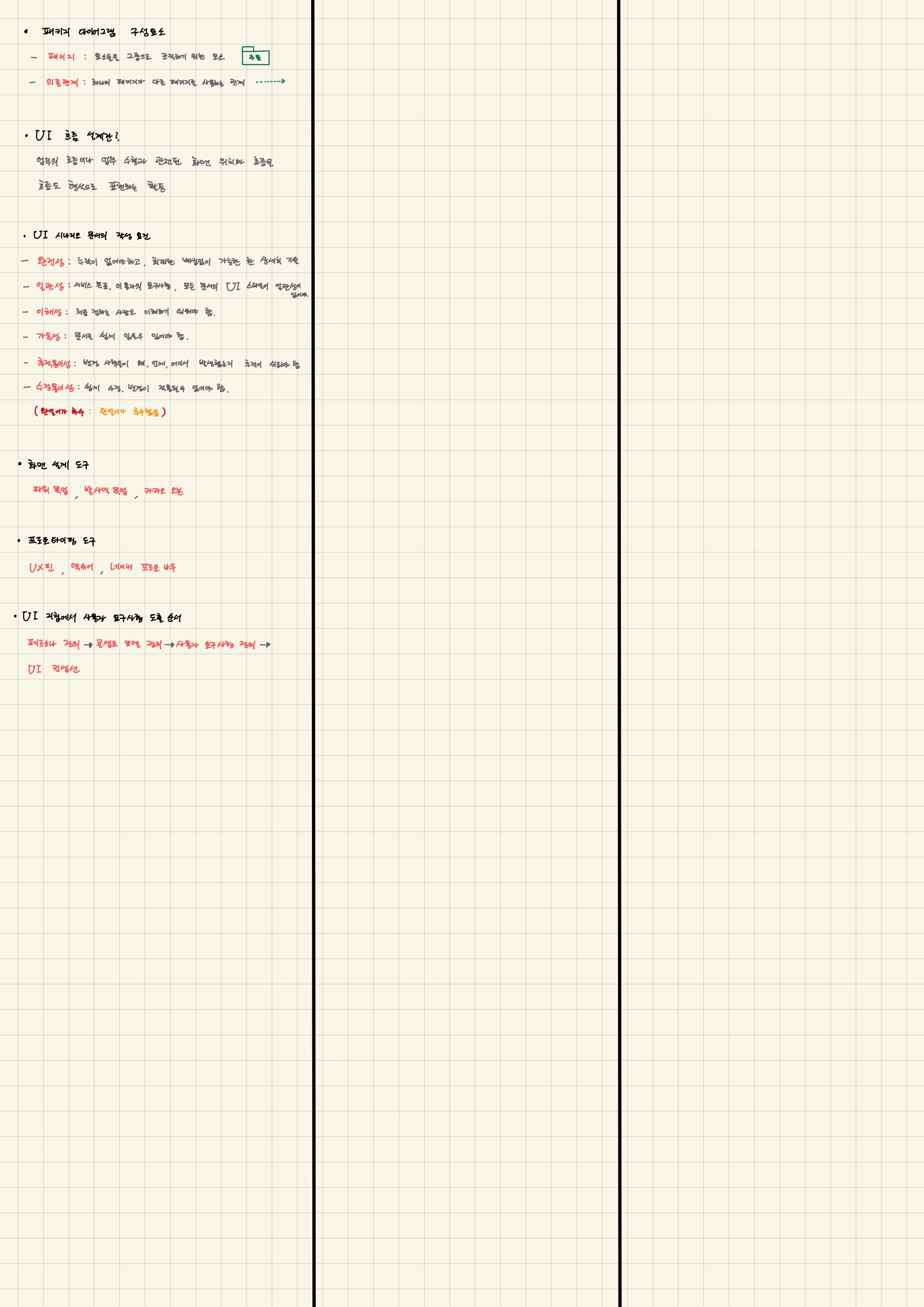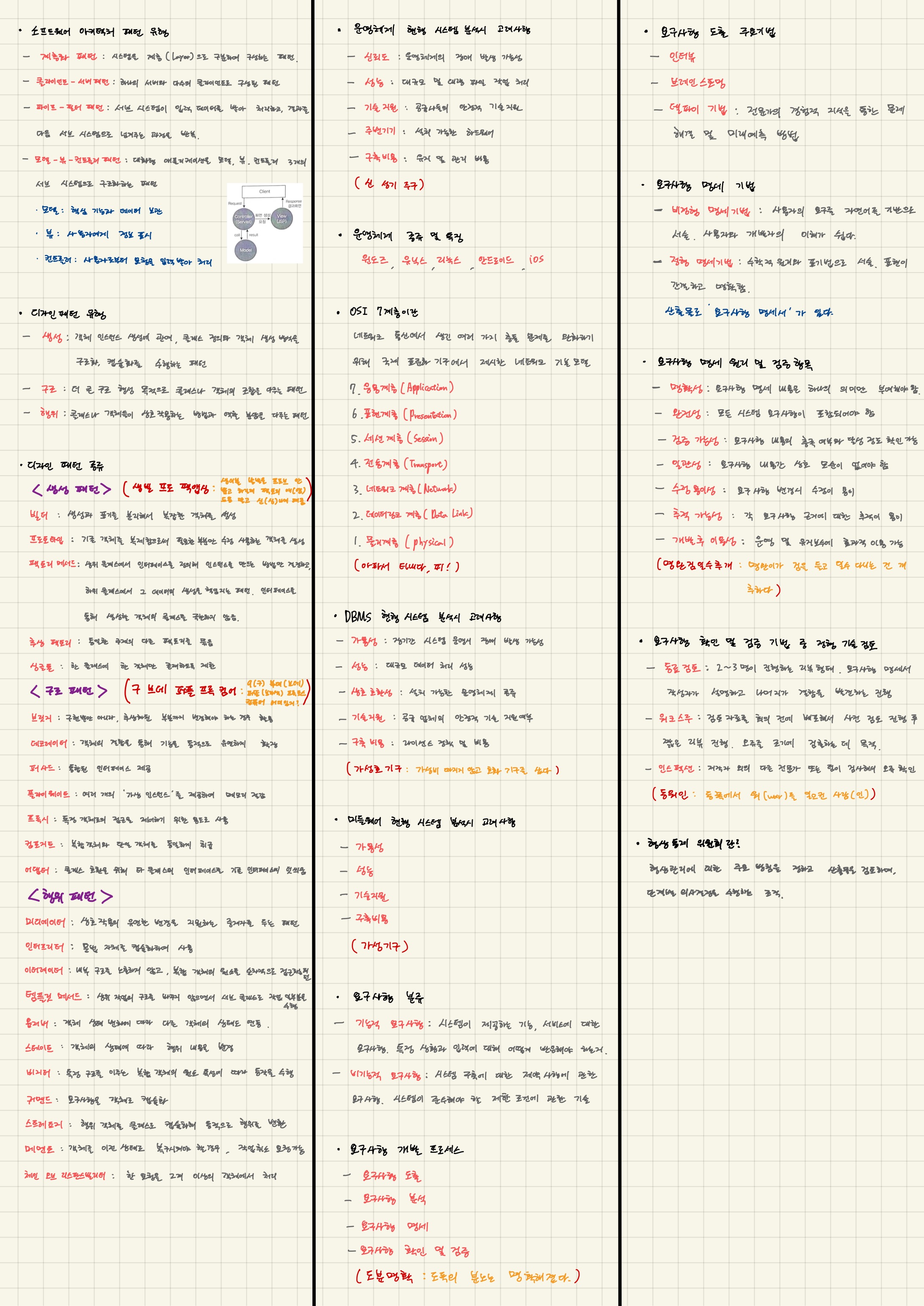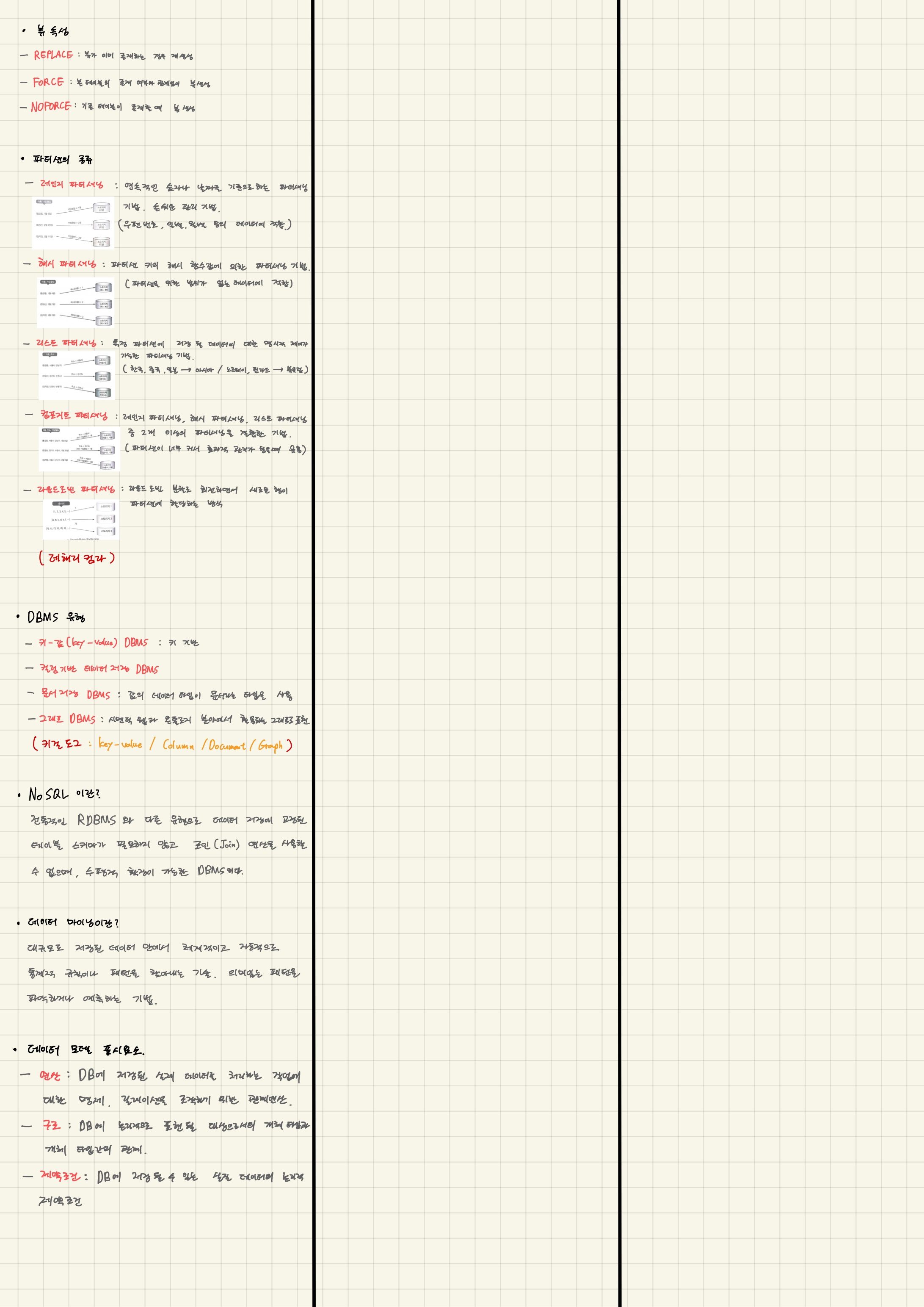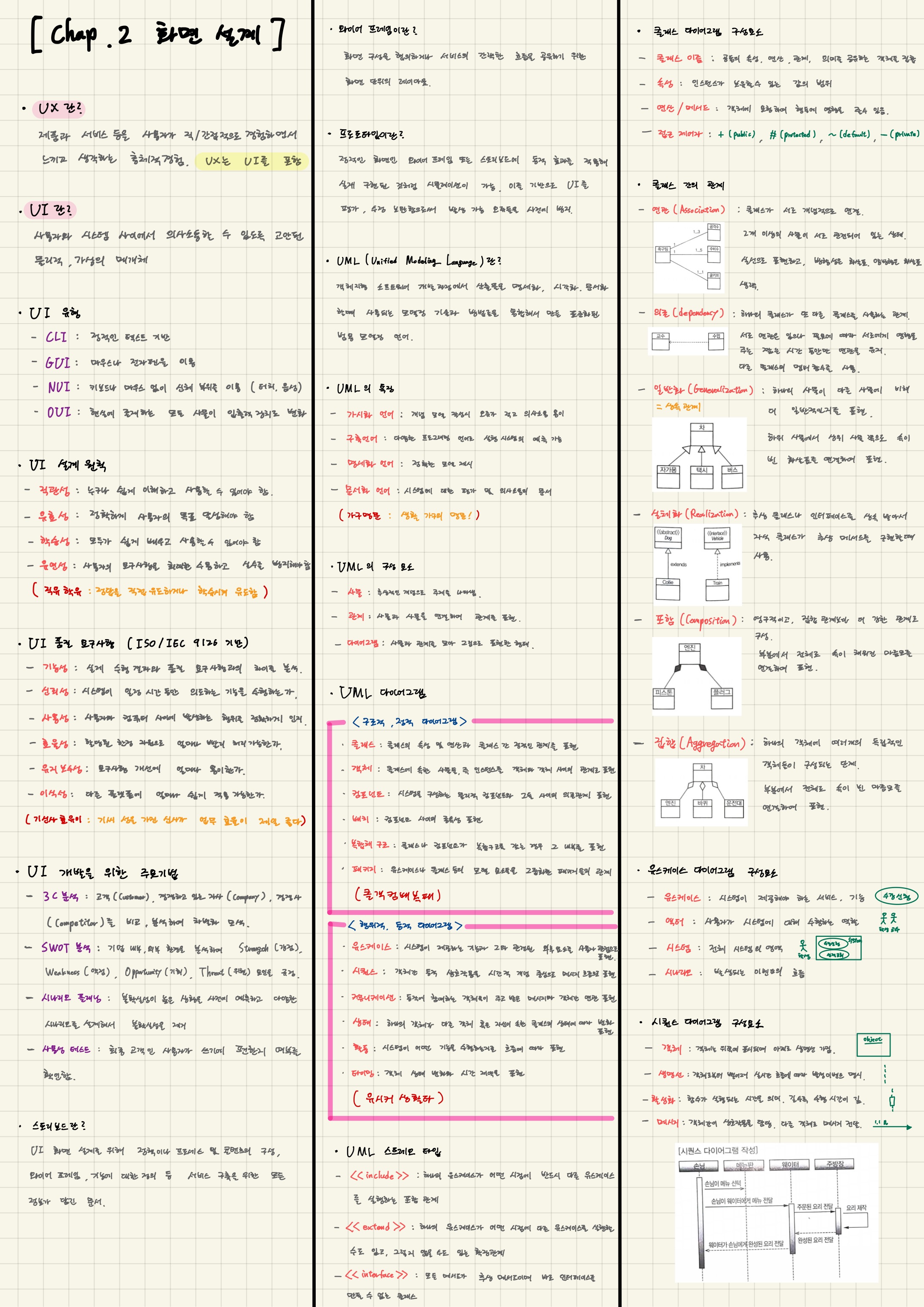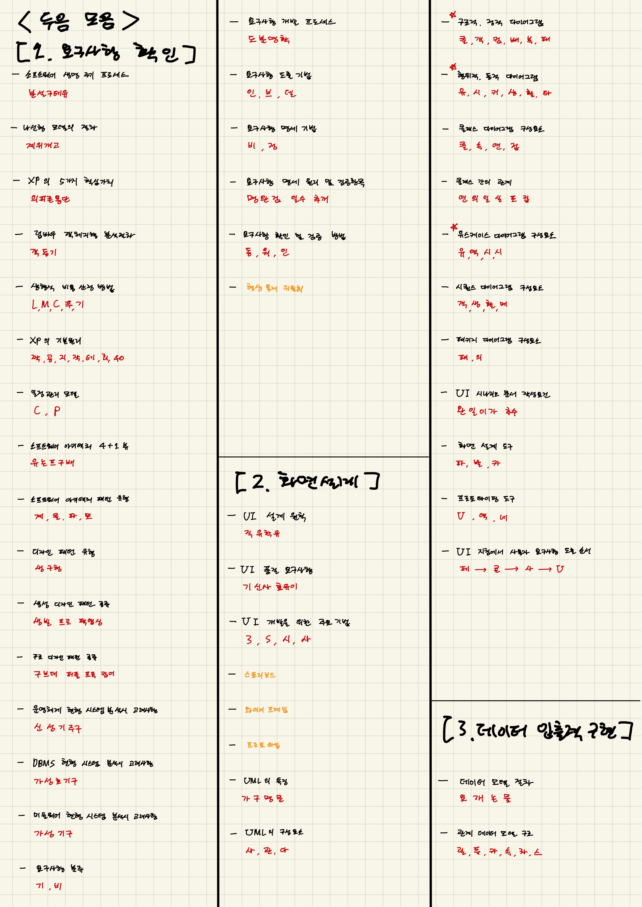 2 회독까지 완료해도 시험장에 갔을 때 원하는 키워드가 떠오르지 않을까 봐 불안했다. 그래서 3 회독까지 결심했다. 하루 6개 챕터의 복습과 더불어 두음 표기로 개념들을 따로 정리했다. 예를 들어 트랜잭션의 특성은 '원일고지(원자성 / 일관성 / 고립성 / 지속성)', UI 설계 원칙은 '직유학유(직관성 / 유연성 / 학습성 / 유효성)' 처럼 말이다. 시험 당일 시험장까지 가는 길에 복습하는 콘텐츠로도 활용할 계획이었다.