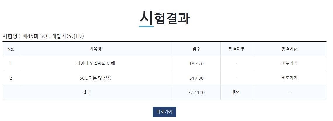 '데이터 모델링의 이해' 영역에서 고득점을 얻었는 반면, 'SQL 기본 및 활용' 영역에선 기대했던 것보다 낮아서 아쉬웠다. 그래도 최선을 다해서 후회는 없다.