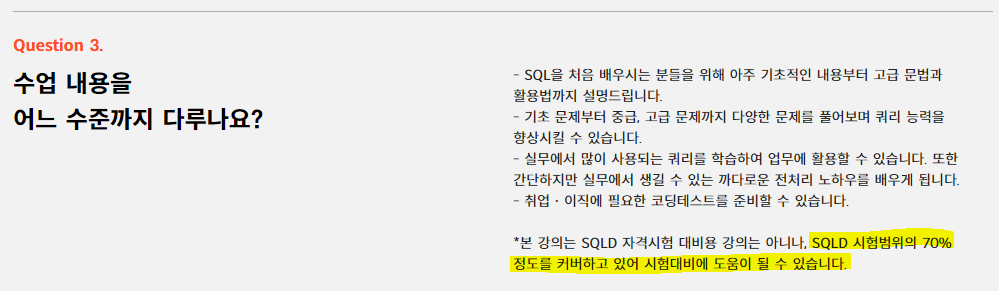 해당 수업에 대한 커리큘럼을 읽던 도중, Q&A에서 'SQLD'란 시험을 처음 보았다. 그때만 해도 개발자에 대한 자격증이 존재하는지 조차 몰랐다. 당연히 SQL 관련 자격증이 있는지도 몰랐다. 하지만 SQLD 자격시험이란 키워드를 여기서 보게 됐고, 바로 구글링과 유튜브를 통해 관련 정보를 찾아봤다. 당시만 해도 해당 자격시험의 진입장벽이 무척 크게 느껴져서 괜한 욕심을 부리지 않으려고 했다. 이제 SQL을 공부하려는 햇병아리가 자격시험까지 건드릴 용기를 가지고 있진 못했다.