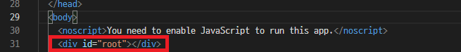 public에는 열어보면 index.html파일이 있다. 파일을 열어보면 코드 중에 id가 root인 div를 찾아 볼 수 있다.