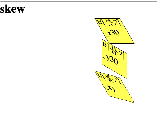transform: skew(30deg, 15deg); /*y축 기준 30도 기울이기 */